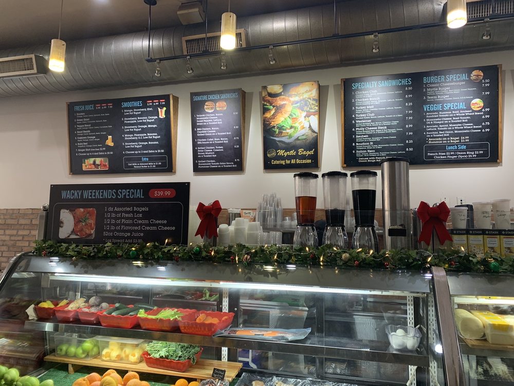 Introducing Myrtle Bagel, located in Brooklyn, NY, this restaurant offers a variety of bagel sandwiches and beverages. The menu features Boar's Head classic sandwiches, including options like Ham, Roasted Beef, and Turkey. Customers have praised the egg white sandwiches and vegan options available. The cozy ambiance, outdoor seating, and free Wi-Fi create a comfortable dining experience. Despite some mixed reviews about service speed and menu availability, Myrtle Bagel seems to cater well to a diverse range of tastes and preferences. With options for breakfast, brunch, and lunch, this spot is a great choice for groups, families, and solo diners alike. Whether you're looking for a quick bite or a relaxing meal, Myrtle Bagel has something for everyone to enjoy.